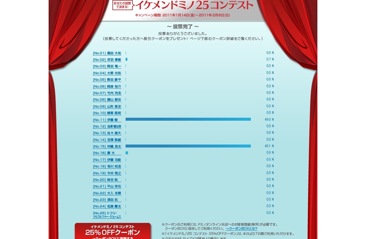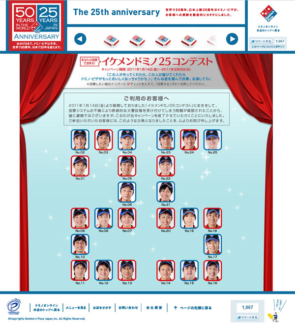 イケメンドミノ25コンテストは1月14日にスタート。ドミノ・ピザの男性店員25人の顔写真や自己紹介を掲載して投票を募っており、2月6日まで投票を受け付ける予定だった。