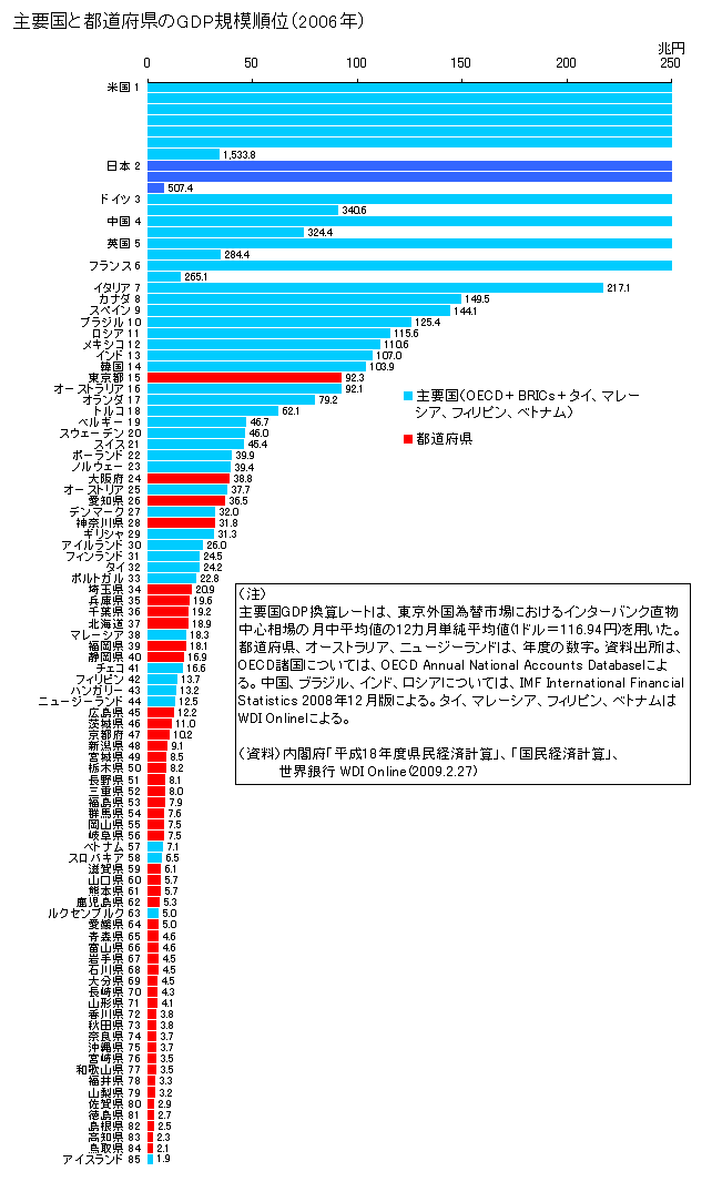 広 島 11.0 山 口 5.6 沖 縄 3.6 主要国と都道府県のGDP順位(2003年)