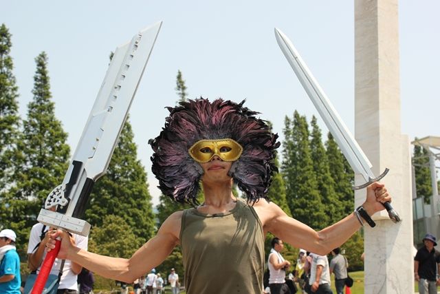 http://mantan-web.jp/gallery/2011/08/13_7/1.html東京ビッグサイト(東京都江東区)で開かれている日本最大の同人誌即売会「コミックマーケット80」は2日目の13日、昨年夏のコミケ2日目より1万人少ない約18万人が来場した。コスプレーヤーが自慢の衣装を披露するコスプレ広場には、人気ゲーム「モンスターハンターポータブル3rd」のモンスター「ジンオウガ」や「ドラゴンクエスト」の「ロトのよろい」姿の「勇者」も登場。来場者の注目を集めていた。