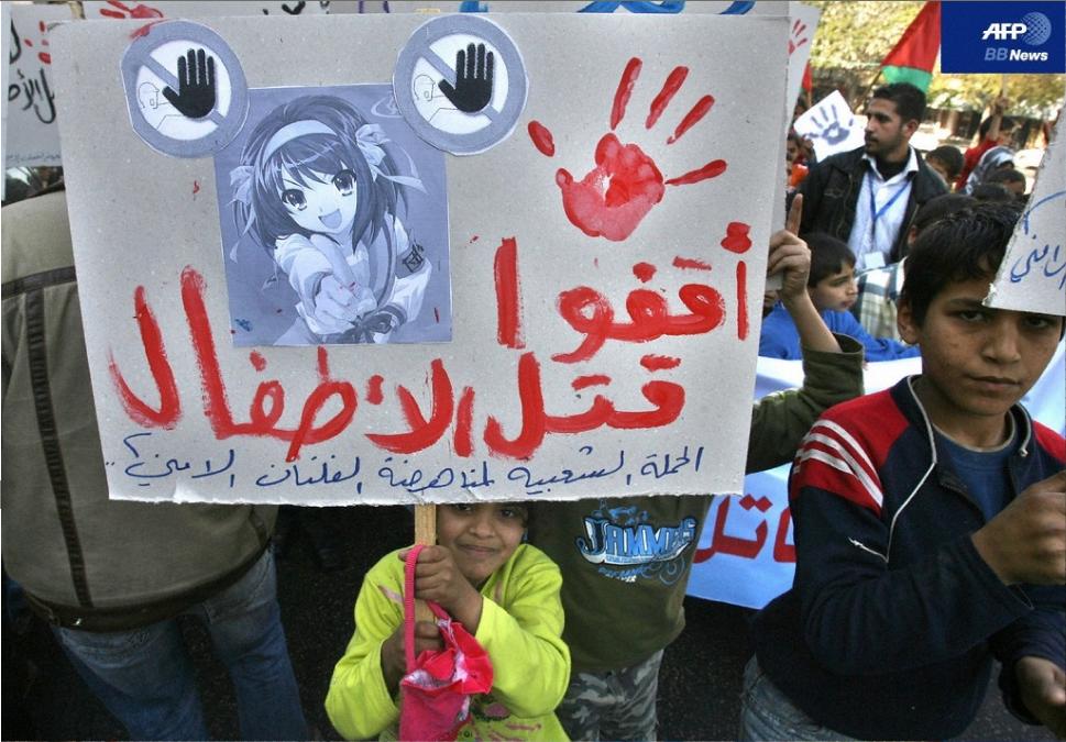 「子どもを殺さないで」 パレスチナの少女、涼宮ハルヒのプラカードを手にデモ行進