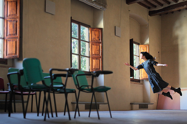 撮影した作品。「重力」が消えた状態を可視化することで、ほのぼのとした日常を、非現実的な風景に