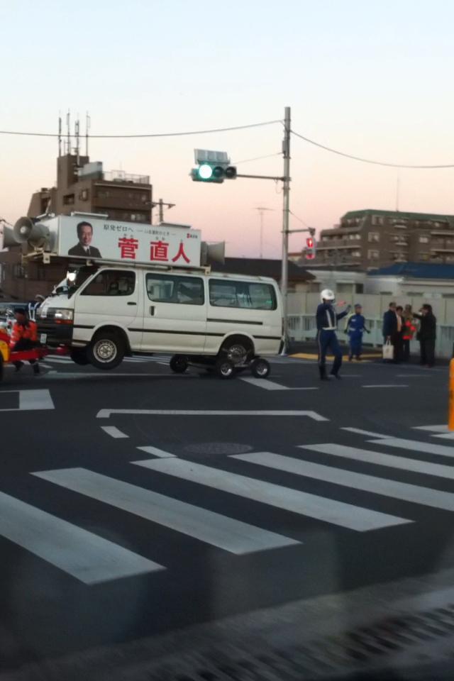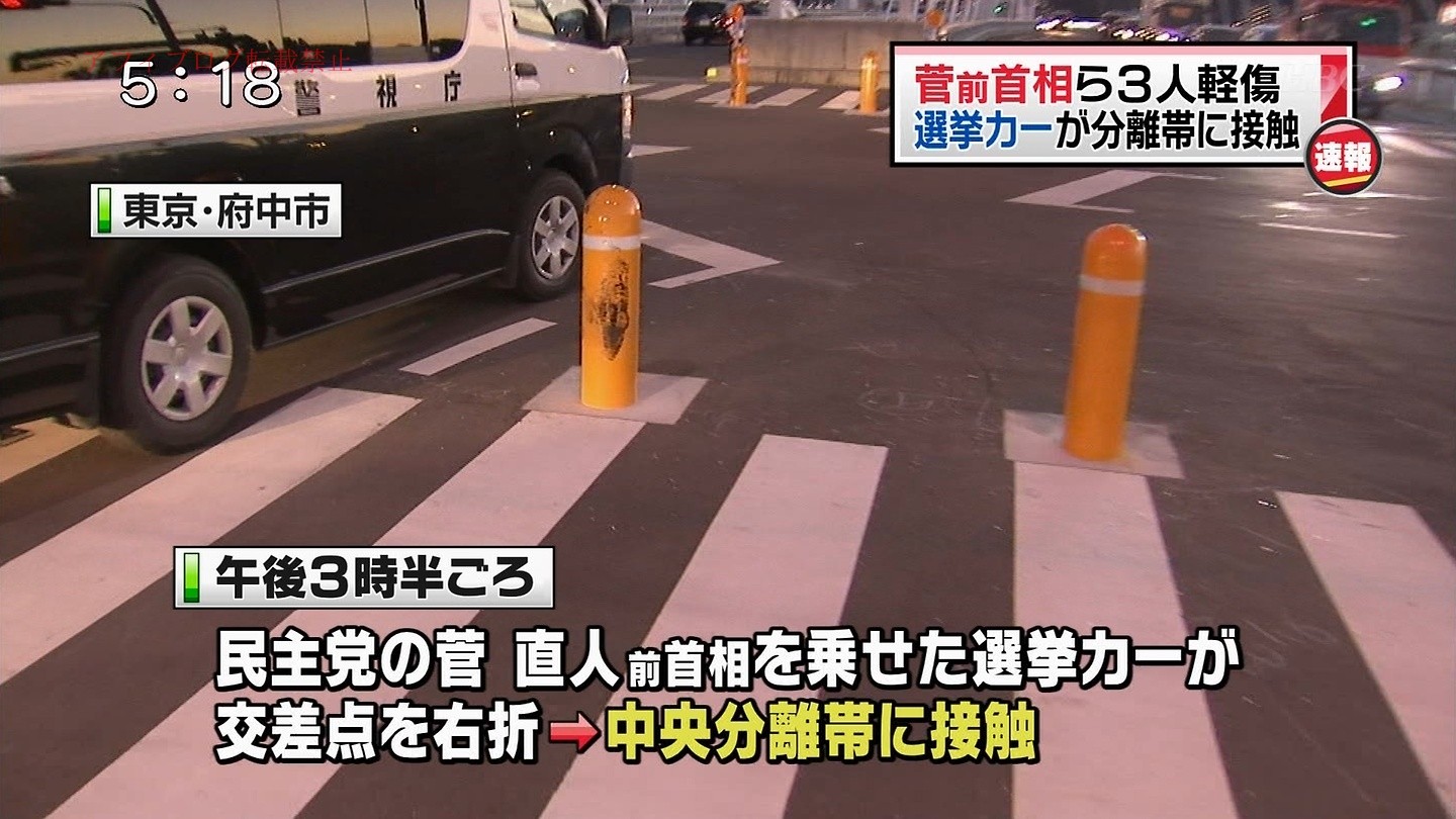 午後3時半ごろ、民主党の菅直人前総理を乗せた選挙カーが、東京・府中市で道路の中央分離帯に接触し、